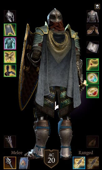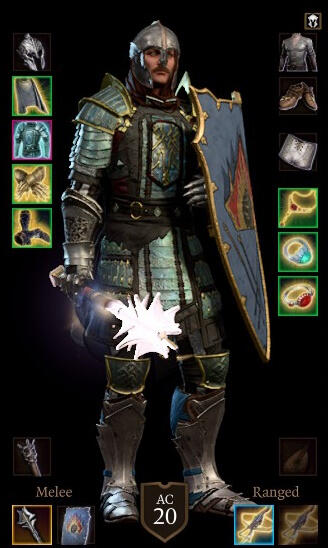 Helm's clerics, by tradition, wear a full-plate armour, an open-faced helmet (sometimes decorated by a plume) and a grey cloak. The devotee's mace is a gift granted by Helm, and the Flaming Fist shield the sign of Ashen's affiliation to this unit.